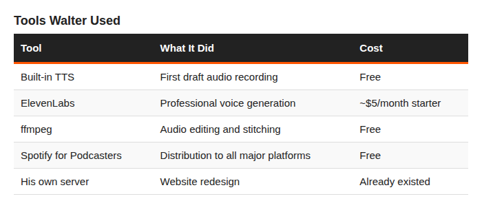 But here’s what I do know. Walter produced two episodes, redesigned a website, posted a job listing for a co-host, and got applications. All while I was eating dinner and helping my son with homework.