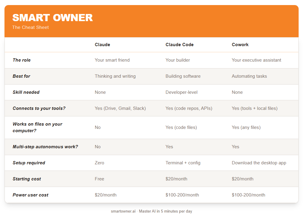 Claude works the same way. One AI, three modes. Claude (the chat) is your smart friend. Claude Code (the terminal tool) is your builder. Cowork (the desktop app) is your executive assistant.