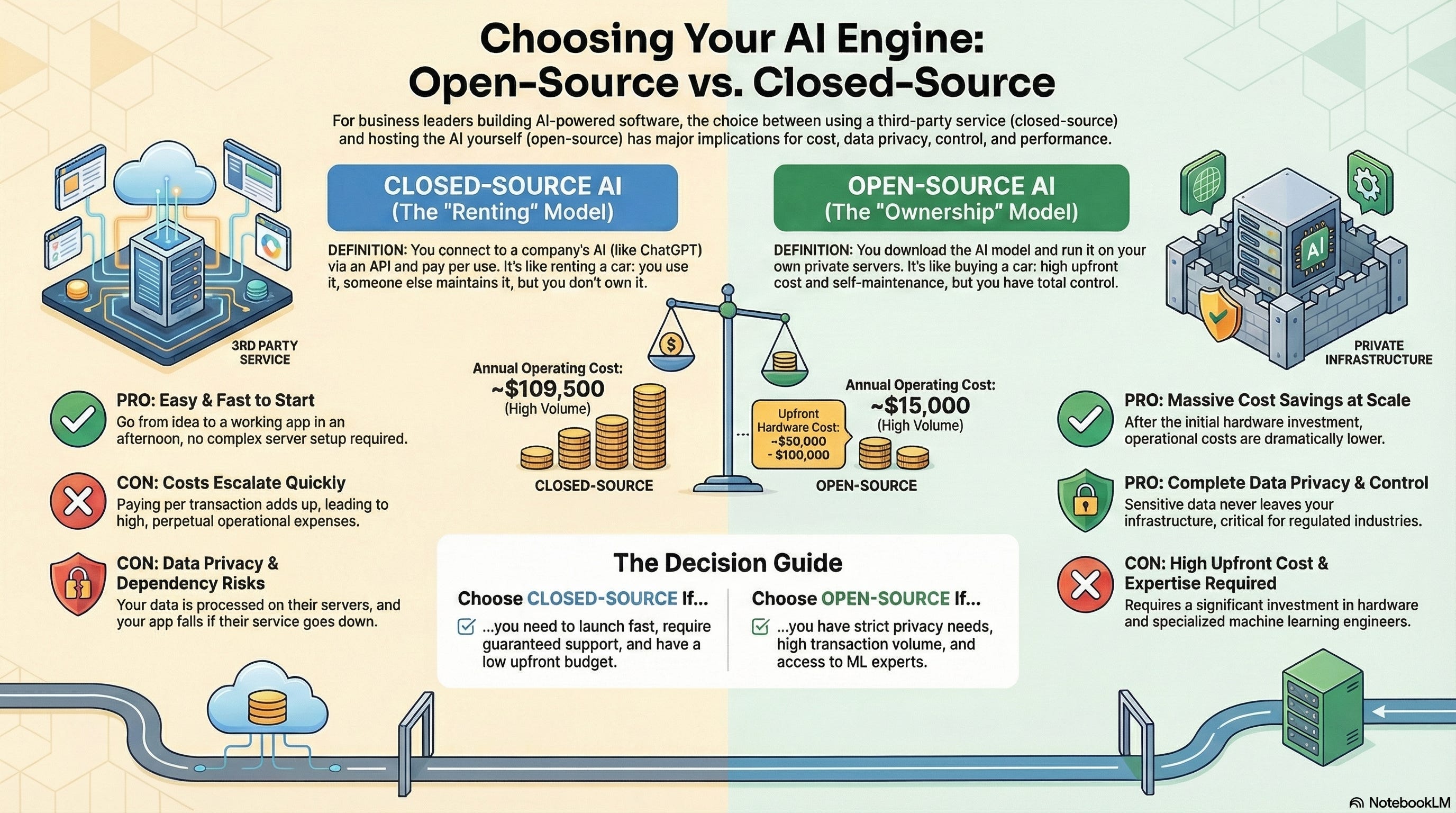 Massive Cost Savings at Scale: After buying servers ($50K-100K upfront), that same customer service bot costs you $15K/year vs. $109K/year. Savings: $94K annually.