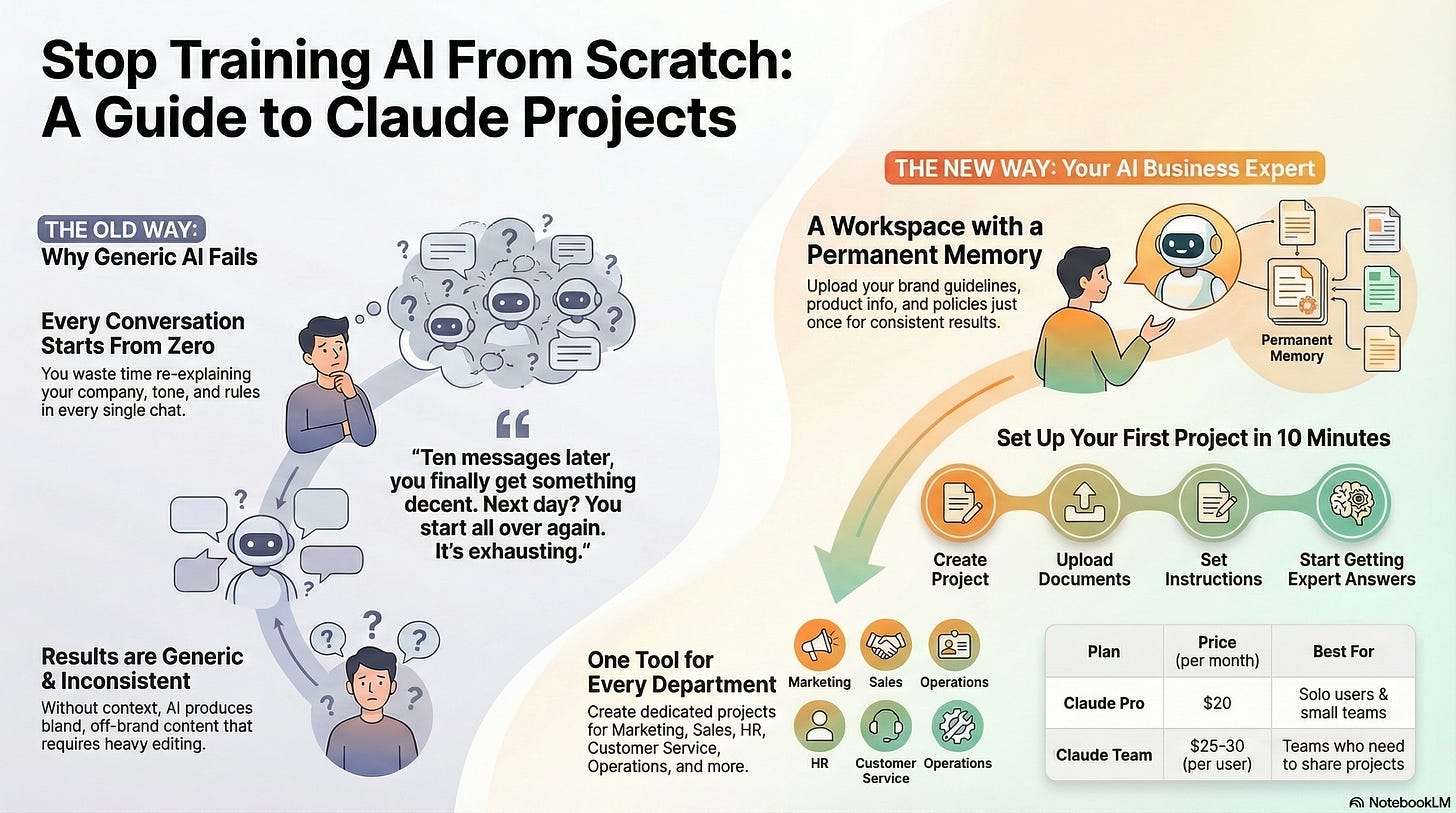 Without Projects: Every time you ask Claude to write a marketing email, you have to paste your brand guidelines, explain your tone of voice, describe your target customer, and hope it gets it right.