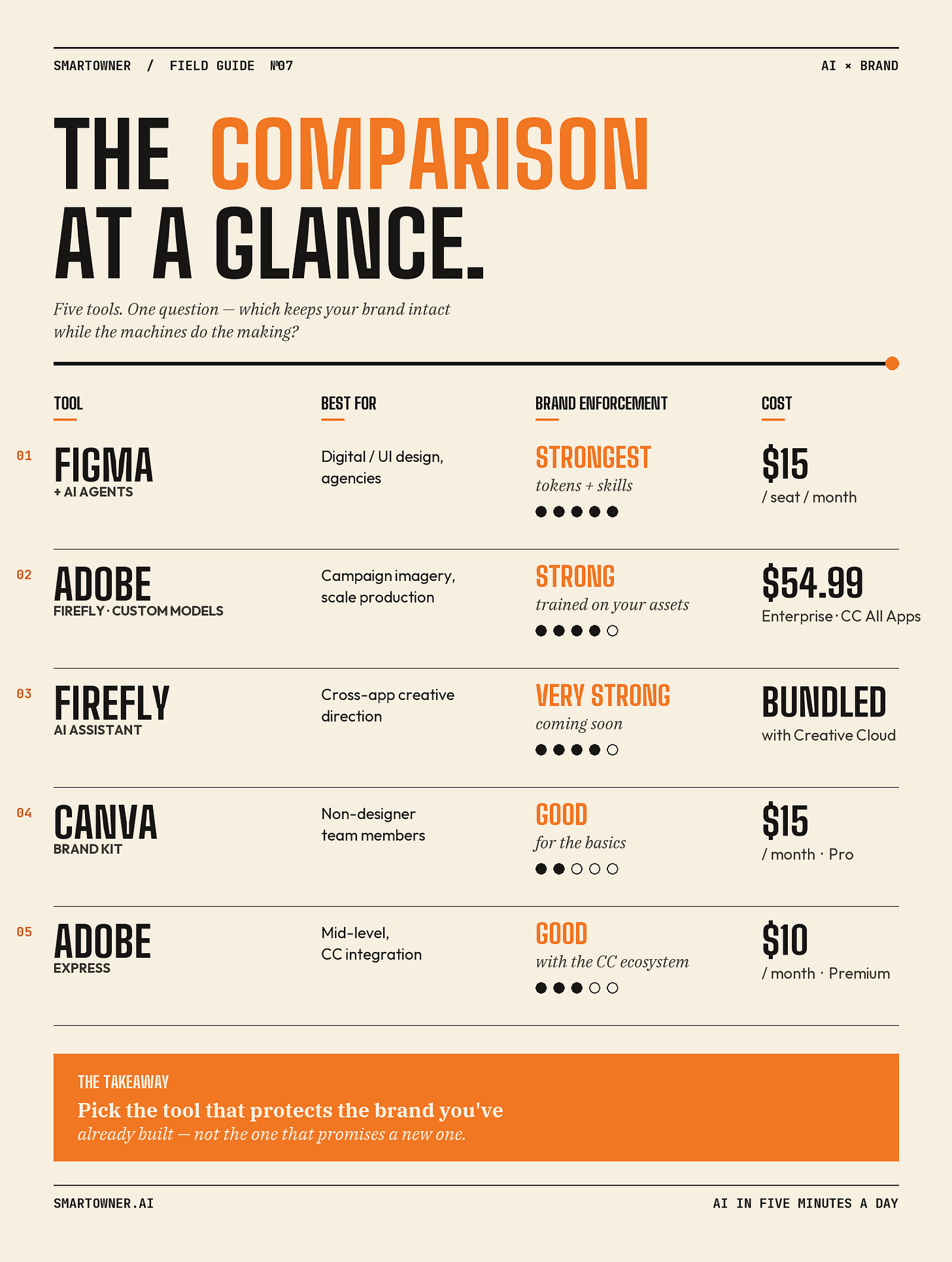 Think of it this way. Your brand guide tells an AI not just “use Pantone 485 red” but “here’s when to use it, how much of it, and what it should never be placed next to.” The AI now understands your brand the way a senior designer does, not just a new hire following a checklist.