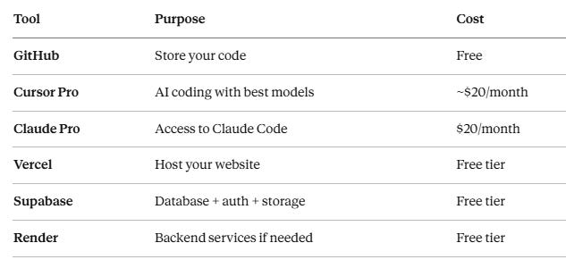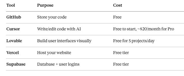 Okay, let’s get practical. If you want to Vibe Code beyond just building pretty user interfaces (like we did with Lovable yesterday), here’s your toolkit: