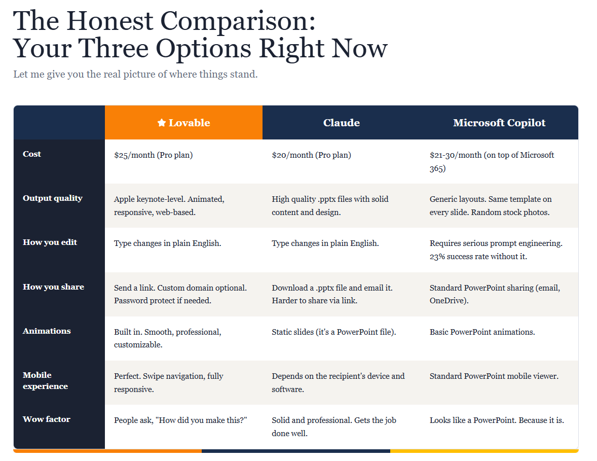Alex Lieberman, the co-founder of Morning Brew (a company built on great content), publicly said he’s shifted from PowerPoint to Lovable for 100% of his slide decks. This isn’t some fringe experiment. It’s happening right now.